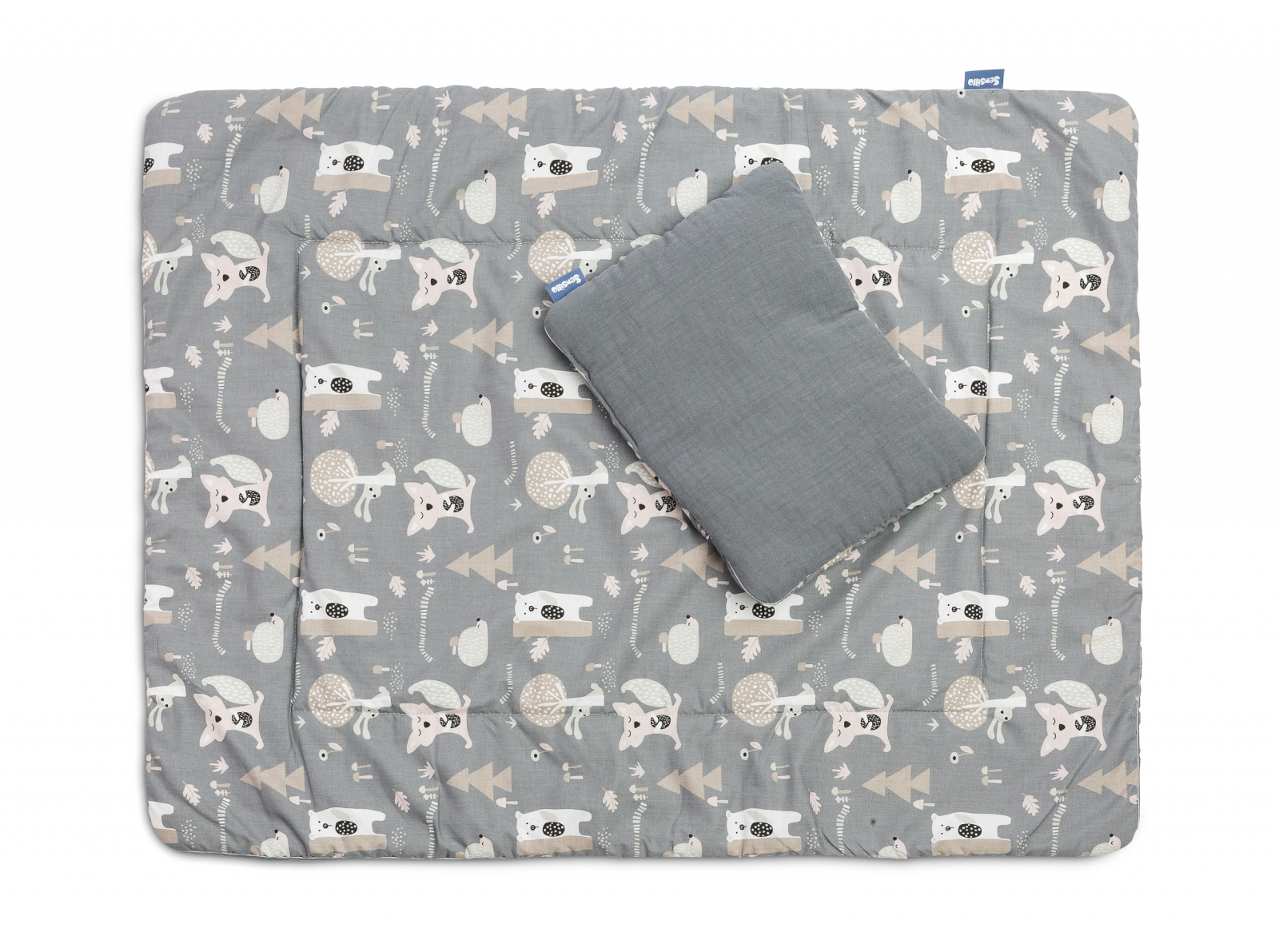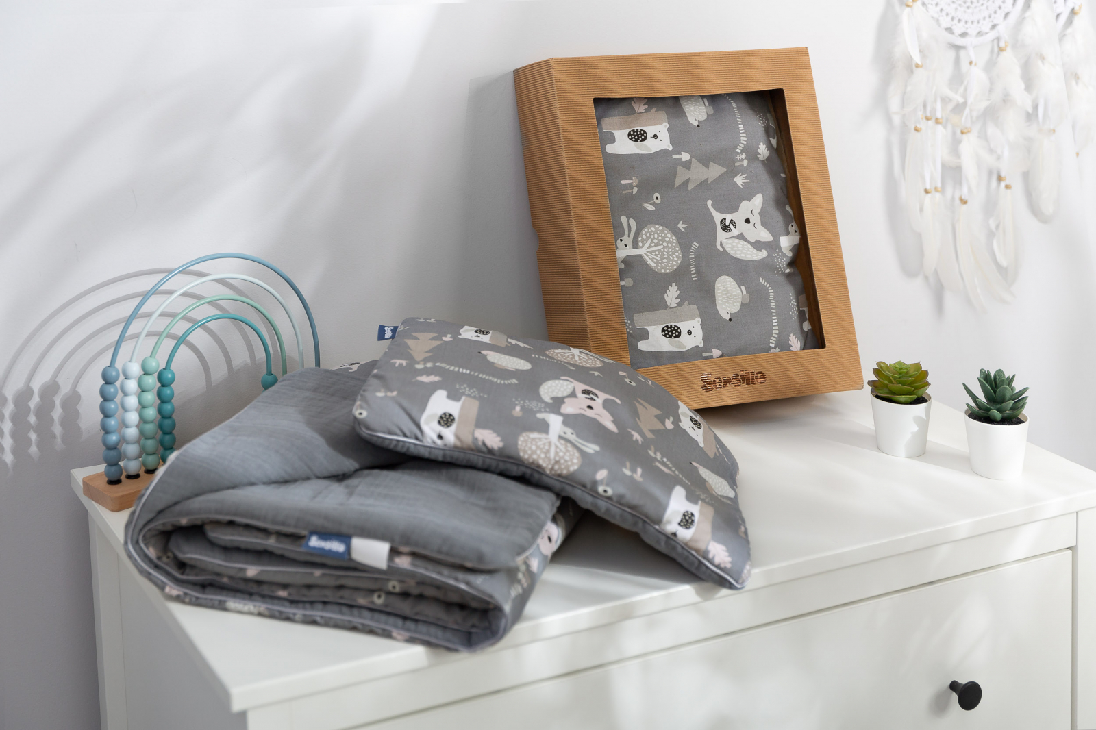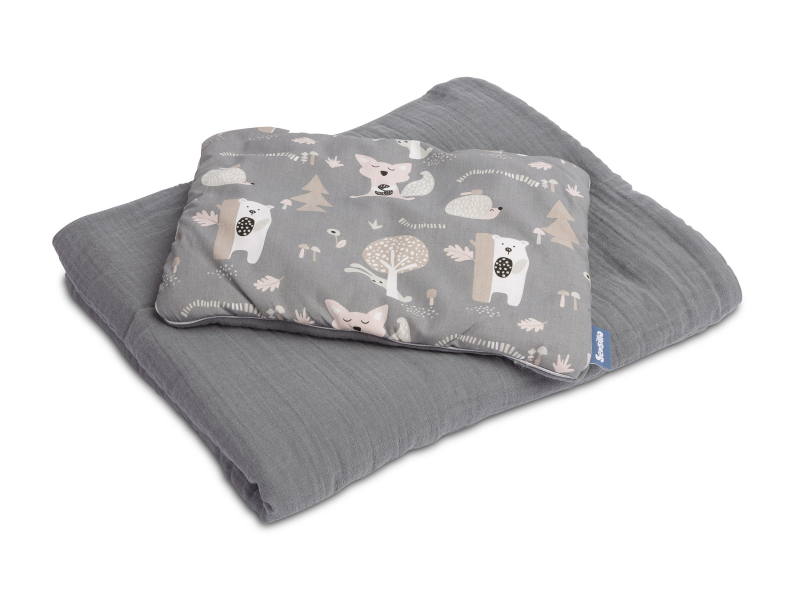 Set paturica + perna, muselina & bumbac (gri cu animale)