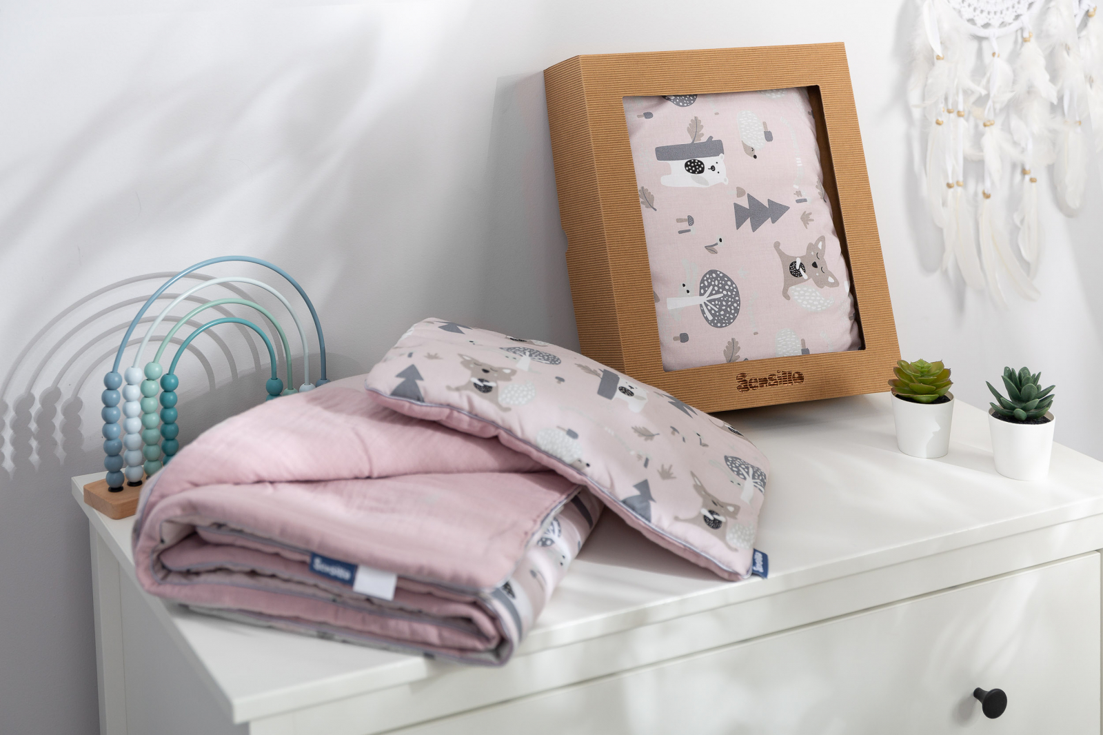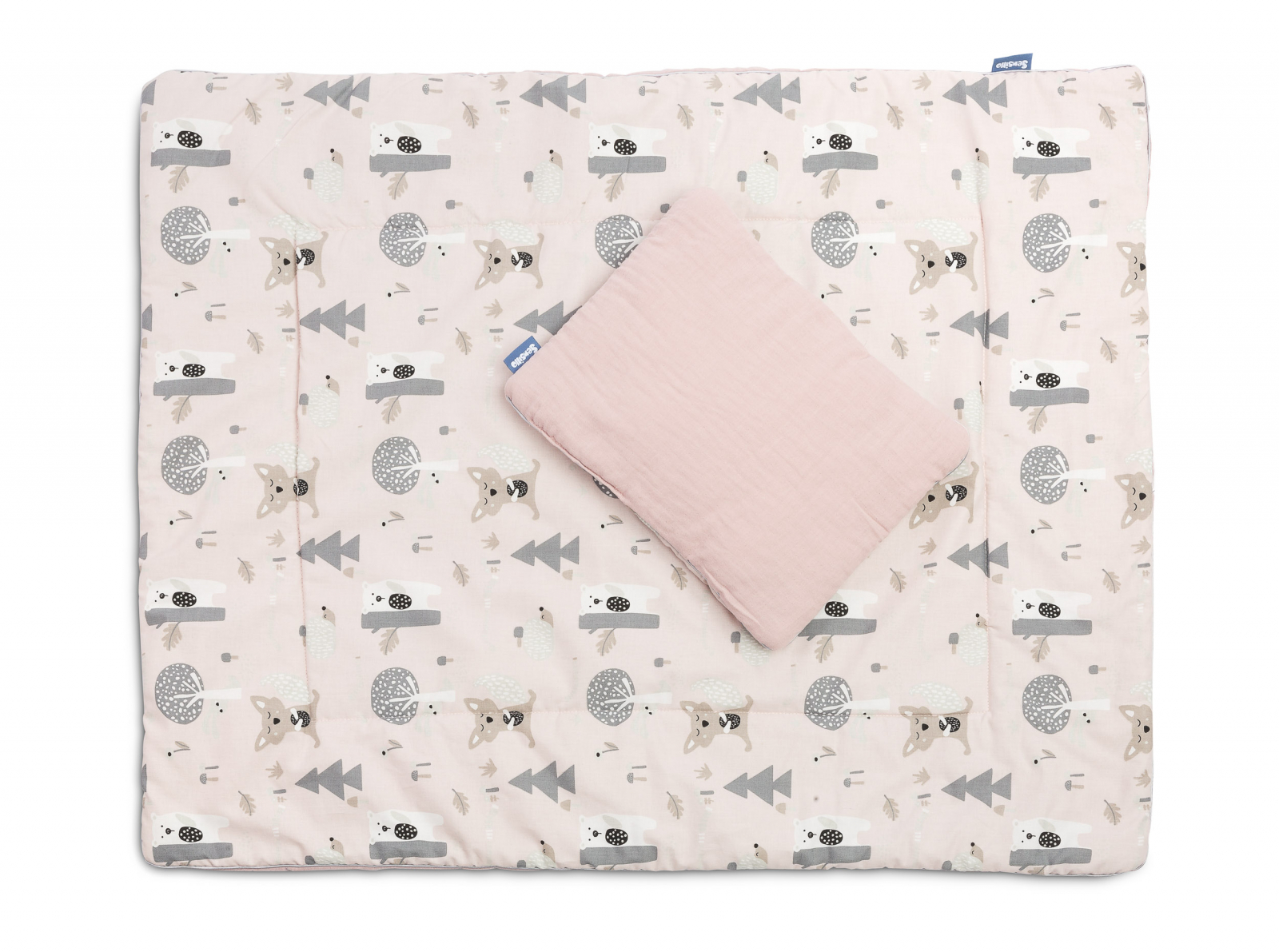 Set paturica + perna, muselina & bumbac (roz cu animale)